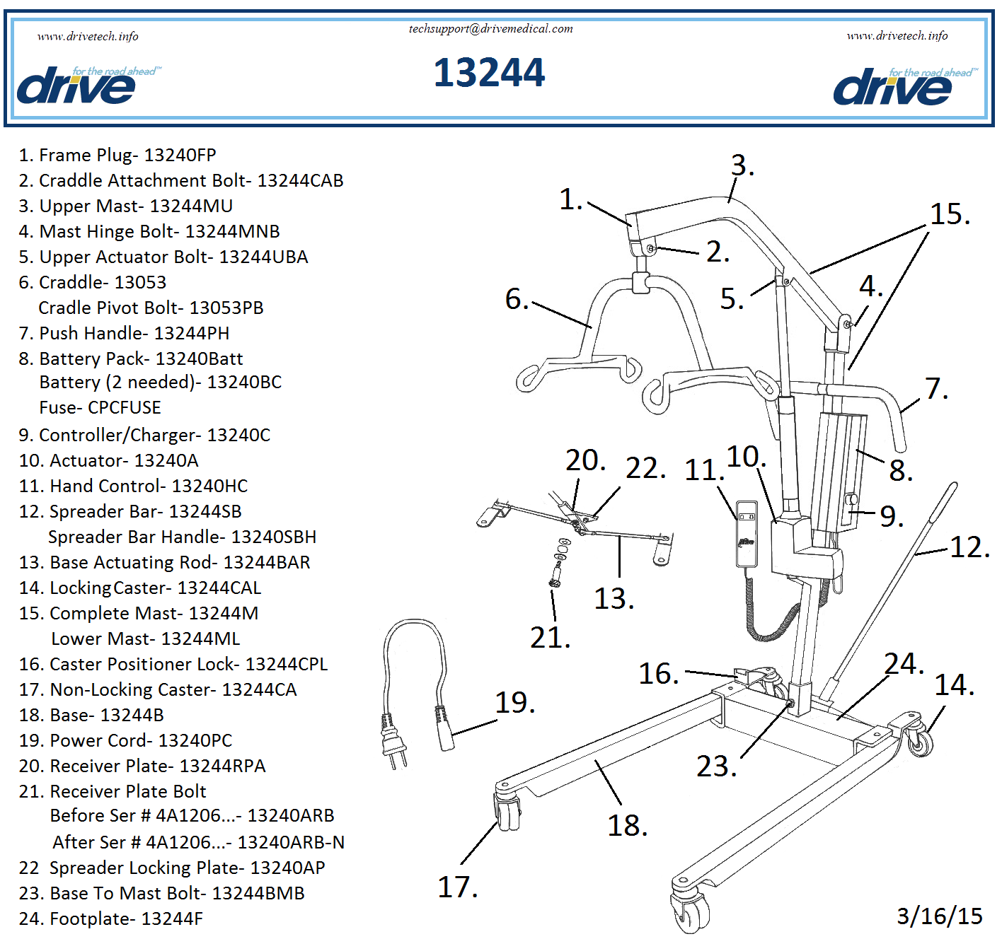 The battery can be charged by plugging in the unit, and never needs to be removed. (The lift will not operate while plugged in.) A jumbo actuator pump that lowers the patient ensures safe repositioning. The pump even includes an emergency button and can be switched to manual mode.