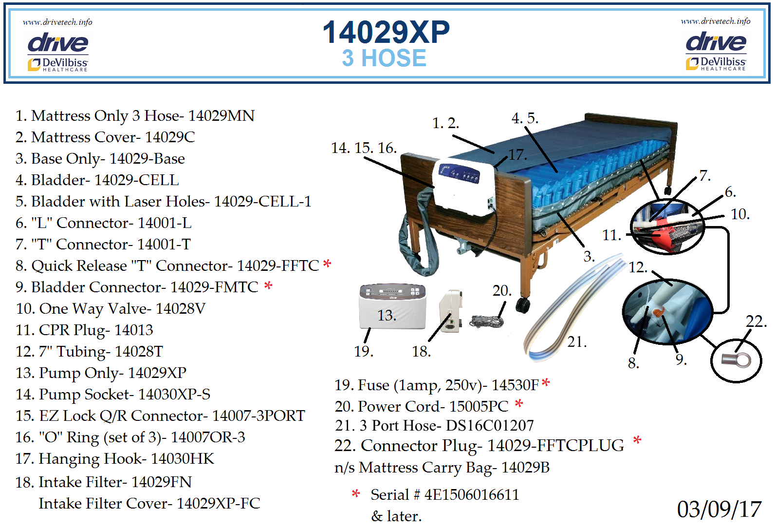 This mattress has a total of 20 air bladders and has specially designed air supply manifolds which quietly operate alternating pressure and air loss systems, while maintaining firm "Defined Perimeter". Cell-on-Cell design prevents "Bottoming Out" in the event of power failure. The LED and Audible alarm activates when mattress pressure falls below 10 mmHg. Spring lined tubing prevents kinks and helps maintain airflow. Quick fill adapter comes standard and CPR valves provide fast (20-Second) deflation.